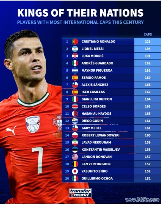 新世纪国家队出场次数排行榜:C罗223场居首,梅西194场次之