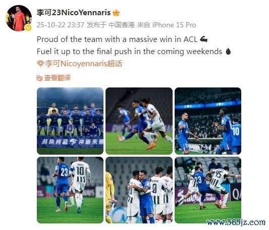 李可社媒:为亚冠获胜 而骄傲,接下来几周的最终冲刺跑 全力以赴