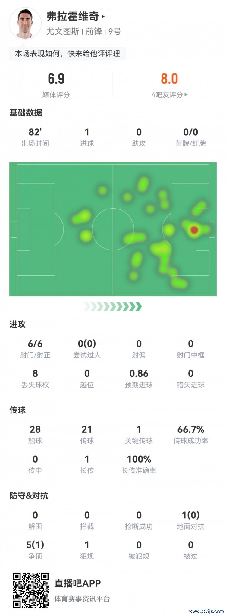弗拉霍维奇本场数据:6射6正,1粒得分 ,1次关键传送球 ,评分6.9