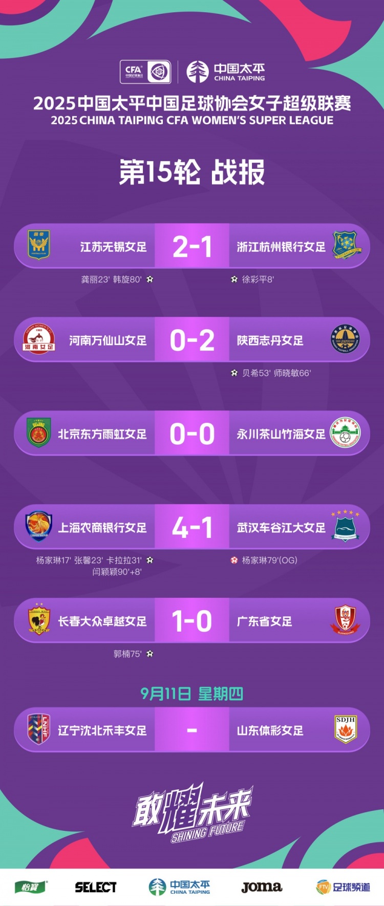 2025女超职业联赛 第15轮战报、积分榜、射手榜