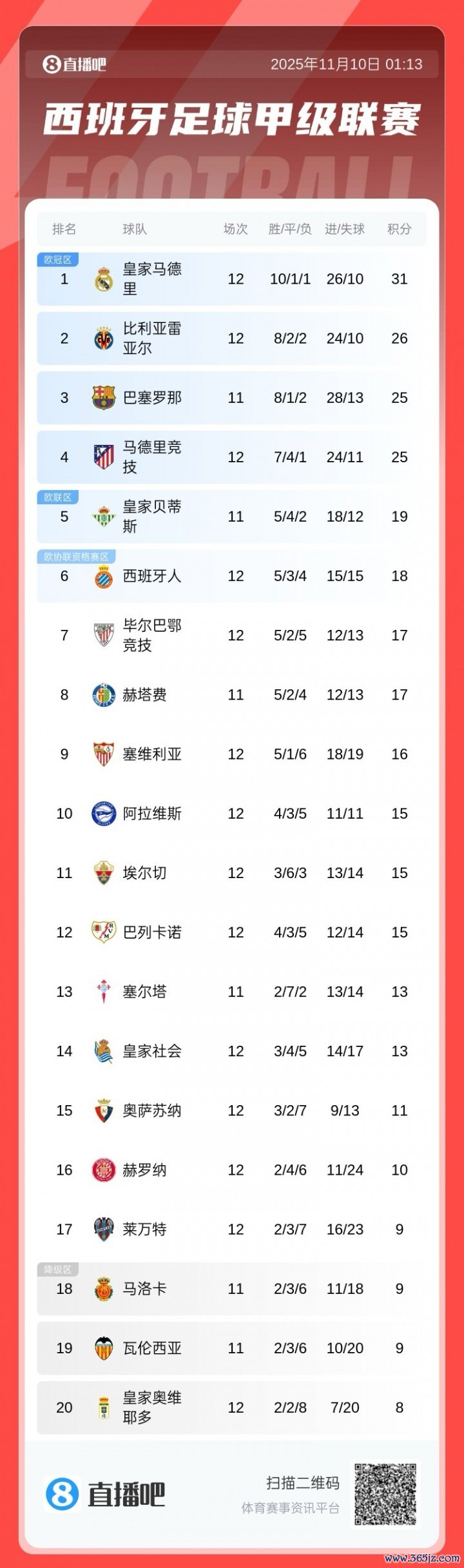 西甲积分榜:皇马31分榜首,巴萨25分稍后客战塞尔塔