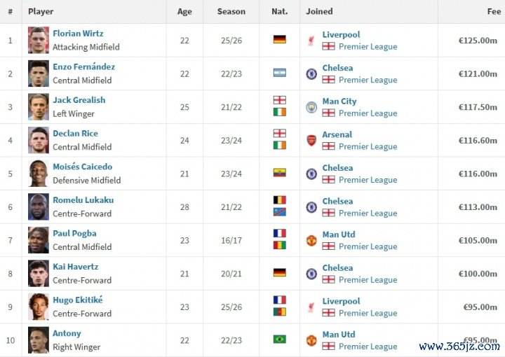 英超职业联赛 历史引援转会费记录 前十(单位:欧元):