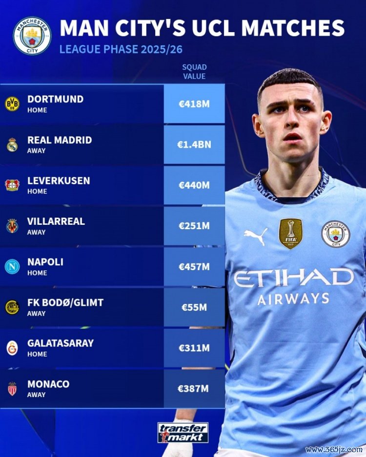 曼城欧冠对手身价:皇马14亿欧最高,那不勒斯4.57亿欧次席