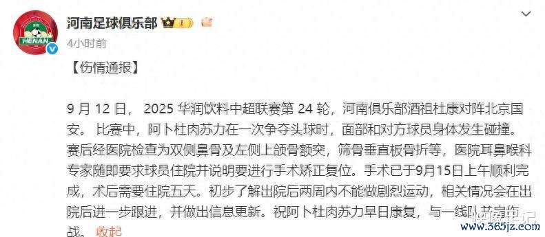 北京时间9月15日上午,河南俱乐部酒祖杜康球员阿卜杜肉苏力鼻子矫正复位手术顺利完成。河南俱乐部官方发布【伤情通报】今晚足球赛现场直播,希望阿卜杜肉苏力早日复健 ,回归赛场。