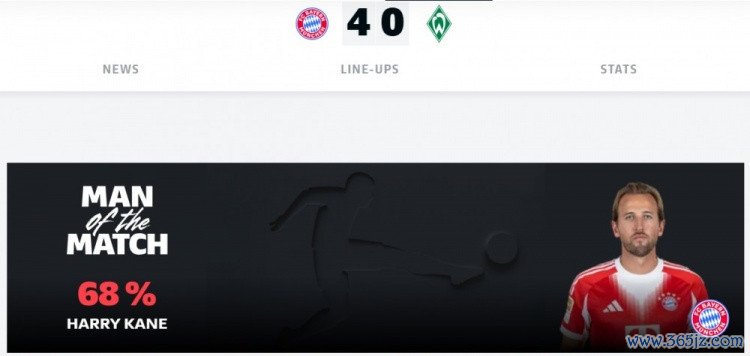 连进两球! 官方: 凯恩当选拜仁4-0不莱梅的全场最佳球员