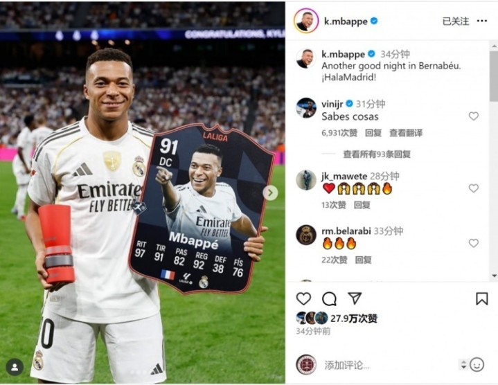 而姆巴佩则通过社媒分享了喜悦,他晒出赛前领取西甲 9 月最佳球员奖杯的照片,配文 “又一个美妙的伯纳乌之夜,Hala Madrid!”,字里行间满是对球队与主场作战 的热爱,也让球迷感受到他当下的良好竞技状态 。