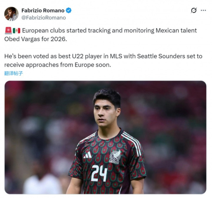 亚足联官宣 罗马诺: 欧洲俱乐部关注西雅图海湾人20岁中场球员巴尔加斯