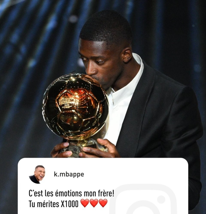 “我也要感谢我的家人,我的母亲。他们一直在我身边,在困难时期支持着我。”登贝莱在感言中动情地说。