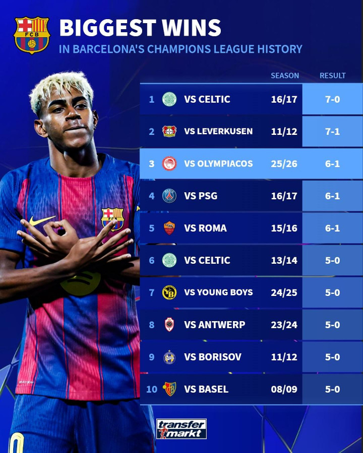 虎扑10月22日讯欧冠职业联赛 阶段第三轮,巴塞罗那6-1横扫奥林匹亚科斯,德国转会市场盘点了巴萨在欧冠历史上取得的最大比分获胜 。