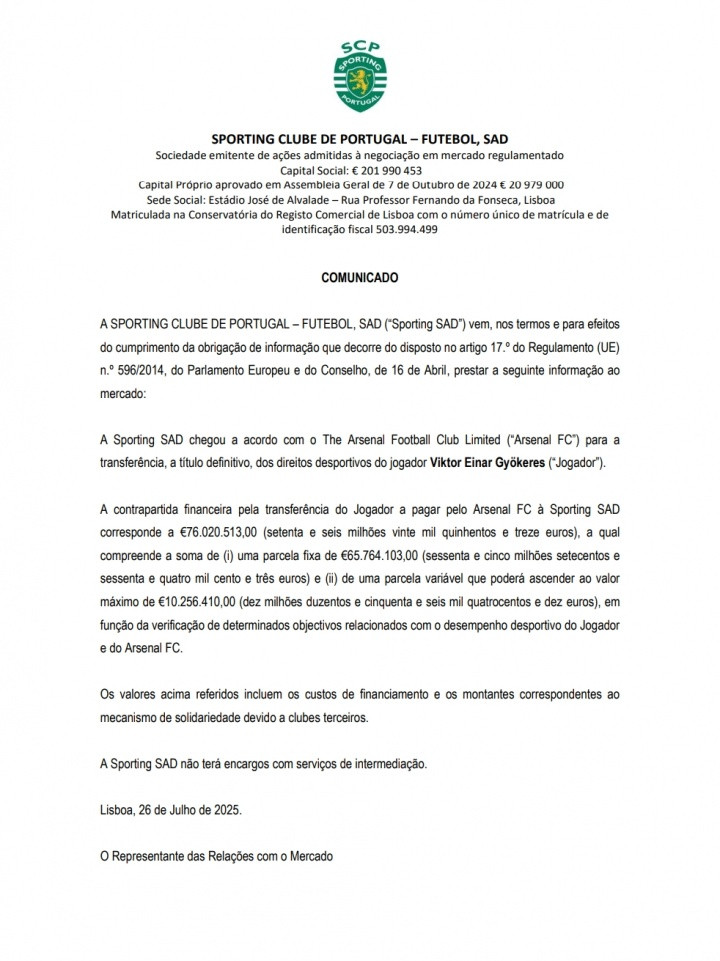 根据规定所产生的信息义务,巴黎圣日耳曼葡萄牙体育俱乐部特此向市场提供以下信息。俱乐部已与阿森纳达成协议, 篮球新闻足球直播吧将球员维克托-埃纳尔-约克雷斯的体育所有权转让。